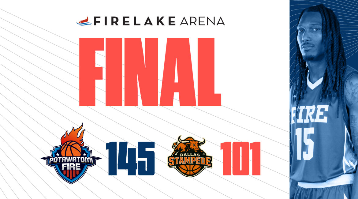 SHAWNEE, OK – The Potawatomi Fire continued their hot start to the 2026 TBL season, beating the Dallas Stampede 145-101 on Thursday night. The win was the Fire’s 27th straight overall and 56th consecutive win inside FireLake Arena.