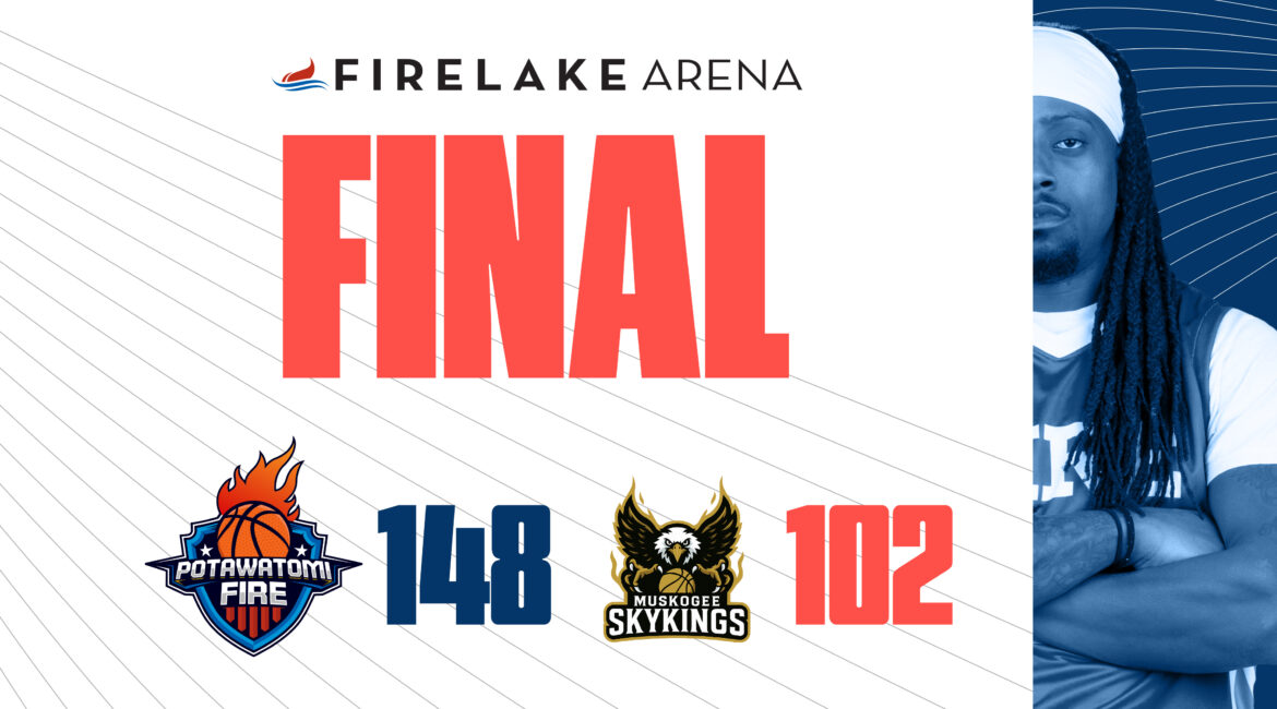 MUSKOGEE, OK – The Potawatomi Fire kept their undefeated season alive with a big 148-102 win over the Muskogee Sky Kings on Friday night. The win was the Fire’s 33rd consecutive win dating back to last season.